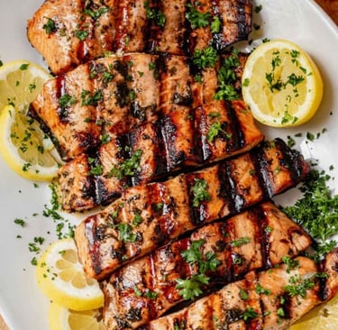 Marinate salmon with olive oil, garlic, lemon, salt & pepper (10–15 mins).